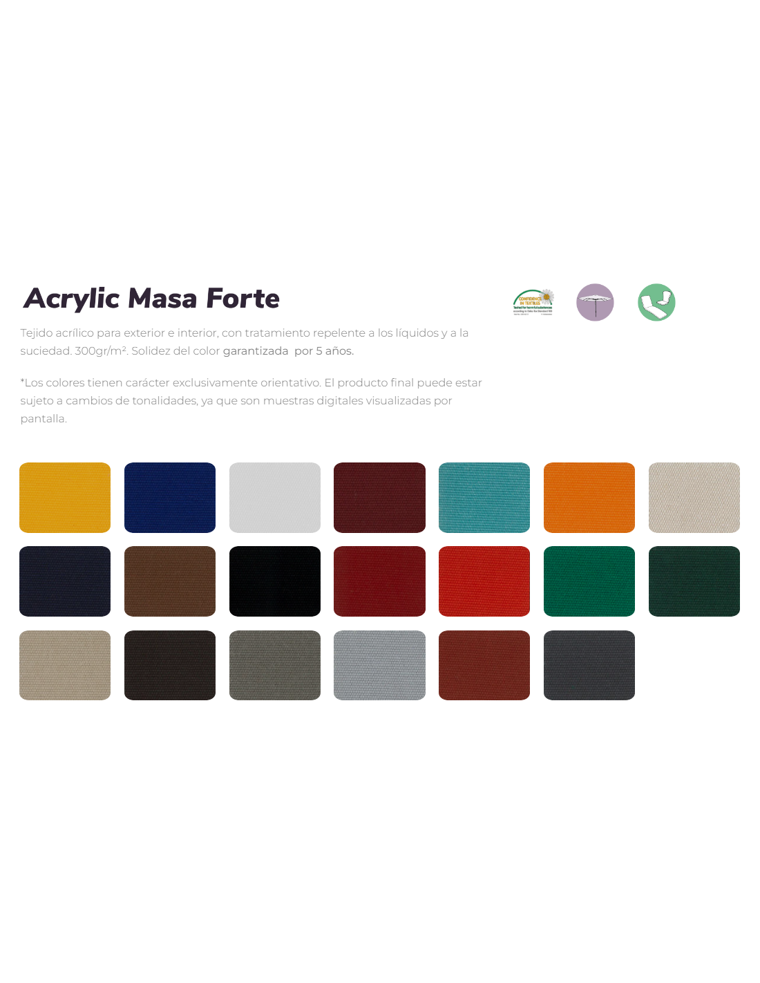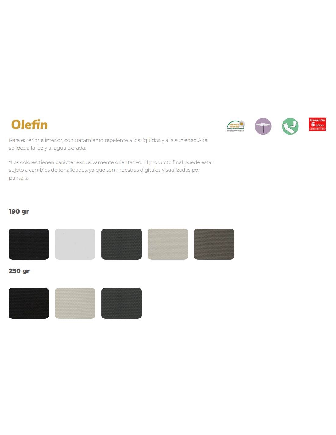 • Olefín 250 gr - Para exterior e interior, con tratamiento repelente a los líquidos y a la suciedad. Alta solidez a la luz y al agua clorada