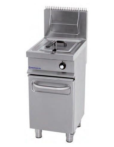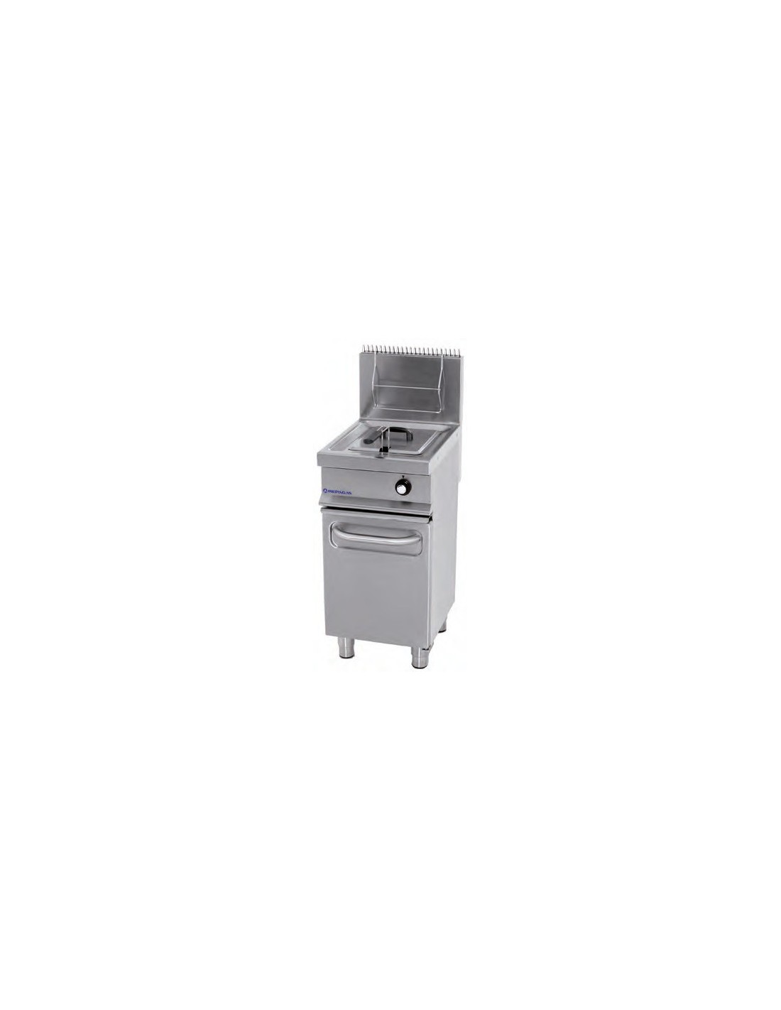 Acabado exterior, cuba y tapa de acero inoxidable AISI-304(18/10) con acabado scotch. Cubas fabricadas en una pieza de un solo golpe de embutición, sin juntas, soldaduras ni tubos de quemador en su interior, prolongando la vida del equipo y reduciendo considerablemente el número de incidencias. Piloto de encendido manual y con piezoeléctrico, termopar, regulación por válvula termostática 820 NOVA MV de 105ºC a 190ºC con termostato de seguridad adicional de calibración fija a 230ºC y quemadores fabricados en acero inoxidable perforados mediante láser. Sistema patentado de funcionamiento a través de perneos comunicantes difusores del calor, garantizando un aumento de la temperatura uniforme desde el nivel inferior del aceite, consiguiendo mayor rendimiento con menor consumo. Sistema "termo-pila" de recuperación rápida de la temperatura. Amplia "zona fría" para facilitar la precipitación de los residuos. Grifo de vaciado y filtro de residuos. Patas regulables en altura