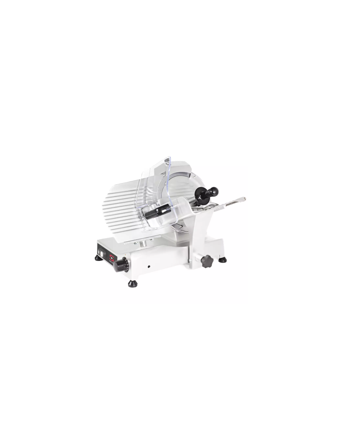 Cortadora de fiambre profesional Sammic GSM-250, con cuchilla de Ø 250 mm. Capacidad de corte de 190 × 220 mm, espesor regulable de 0 a 16 mm y recorrido del carro de 215 mm. Potencia total de 220 W.