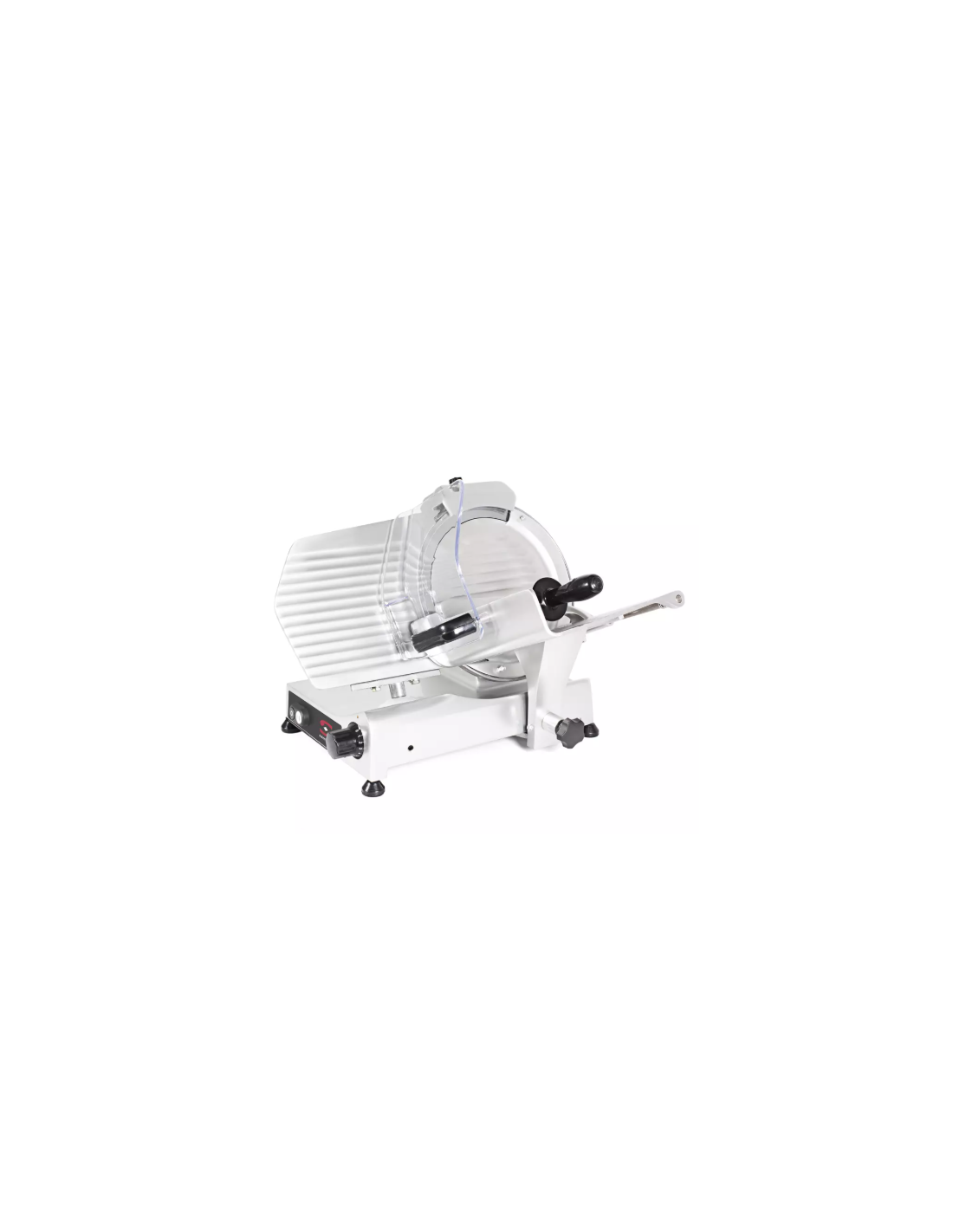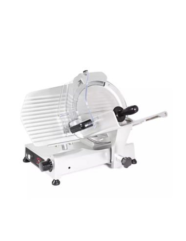 Cortadora de fiambre profesional Sammic GSM-300, con cuchilla de Ø 300 mm. Capacidad de corte de 210 × 220 mm, espesor regulable de 0 a 16 mm y recorrido del carro de 260 mm. Potencia total de 246 W. Peso neto 20,7 kg.