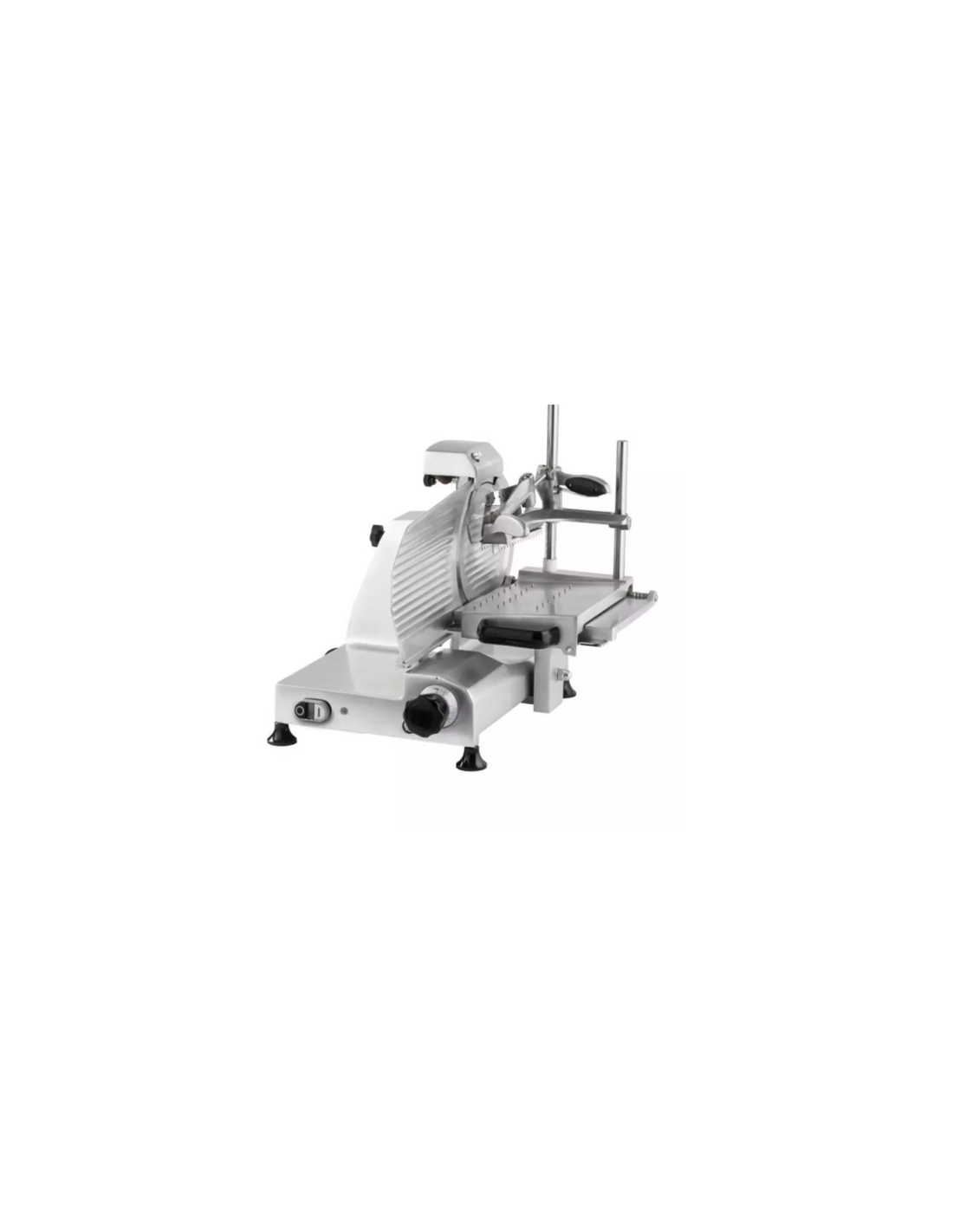 Cortadora vertical profesional Sammic VSS-300, con cuchilla de Ø 300 mm. Capacidad de corte de 195 × 240 mm, espesor regulable de 0 a 16 mm y recorrido del carro de 240 mm. Potencia total de 260 W. Peso neto 27 kg.