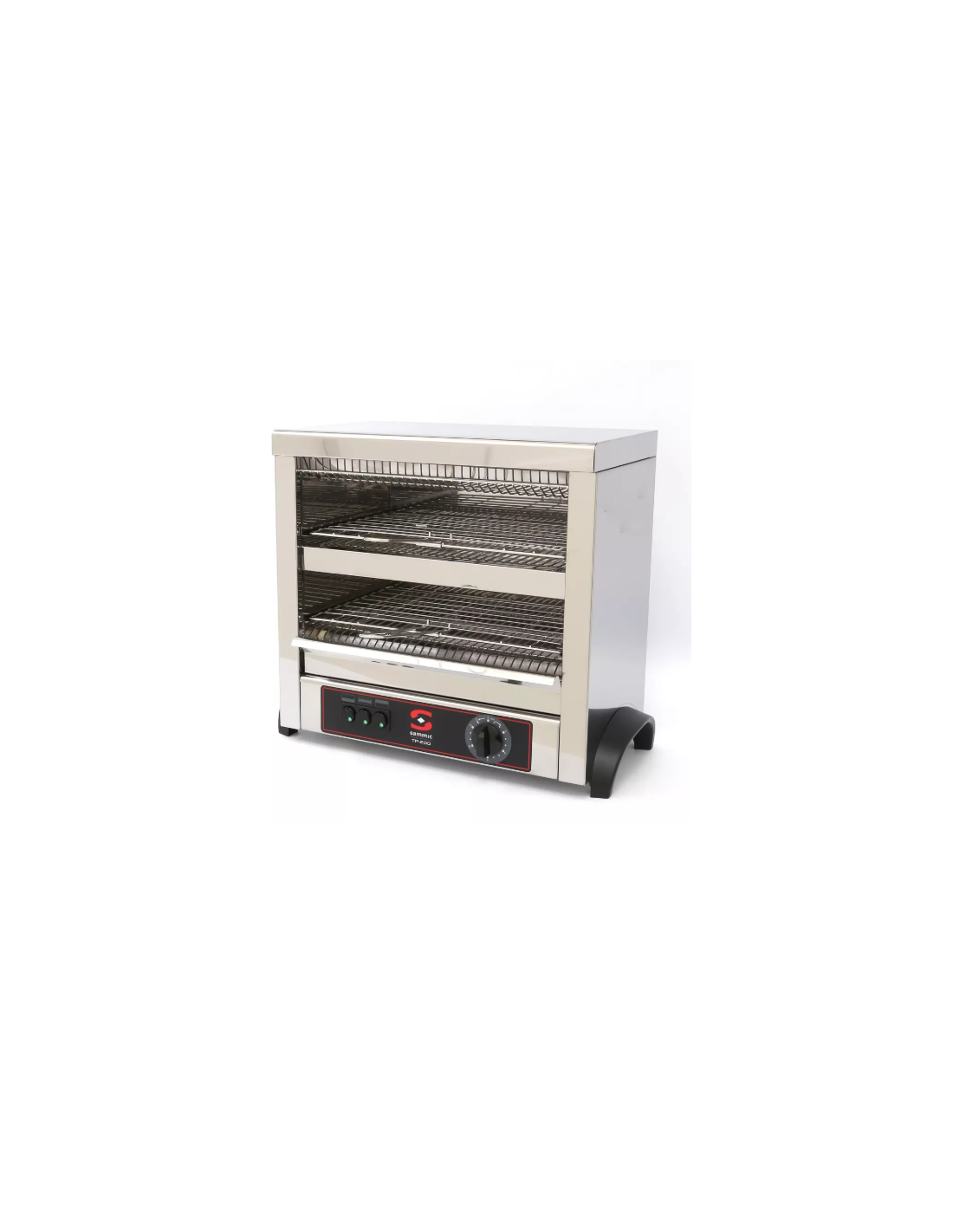 Tostador profesional Sammic TP-200, dos pisos, con resistencias de cuarzo y temporizador de 0 a 15 minutos. Capacidad máxima: 240 tostadas/hora. Altura interior útil por piso: 50 mm.