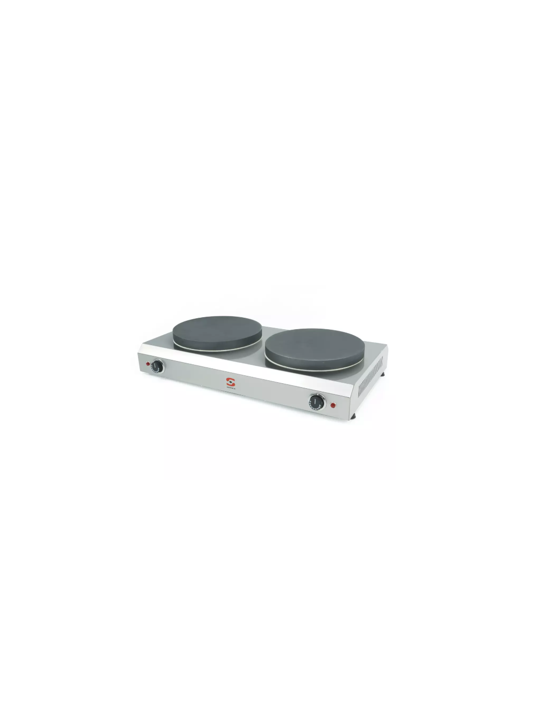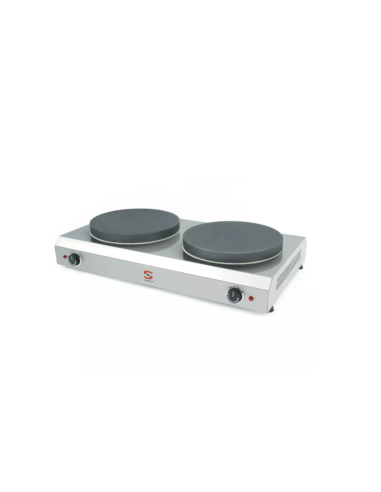 Este modelo doble mantiene la calidad de fabricación profesional de Sammic, con una estructura exterior de acero inoxidable resistente y fácil de limpiar. Dispone de dos placas de cocción de hierro fundido, que incorporan un tratamiento antiadherente para cocinar sin que la masa se pegue y prolongar la vida útil del equipo sin necesidad de recubrimientos adicionales. Los elementos calefactores eléctricos aseguran una distribución uniforme del calor en cada plato, lo que resulta esencial para obtener crepes perfectamente dorados y consistentes. Es ideal para negocios con gran volumen de clientes, como hoteles, buffets y grandes cafeterías.