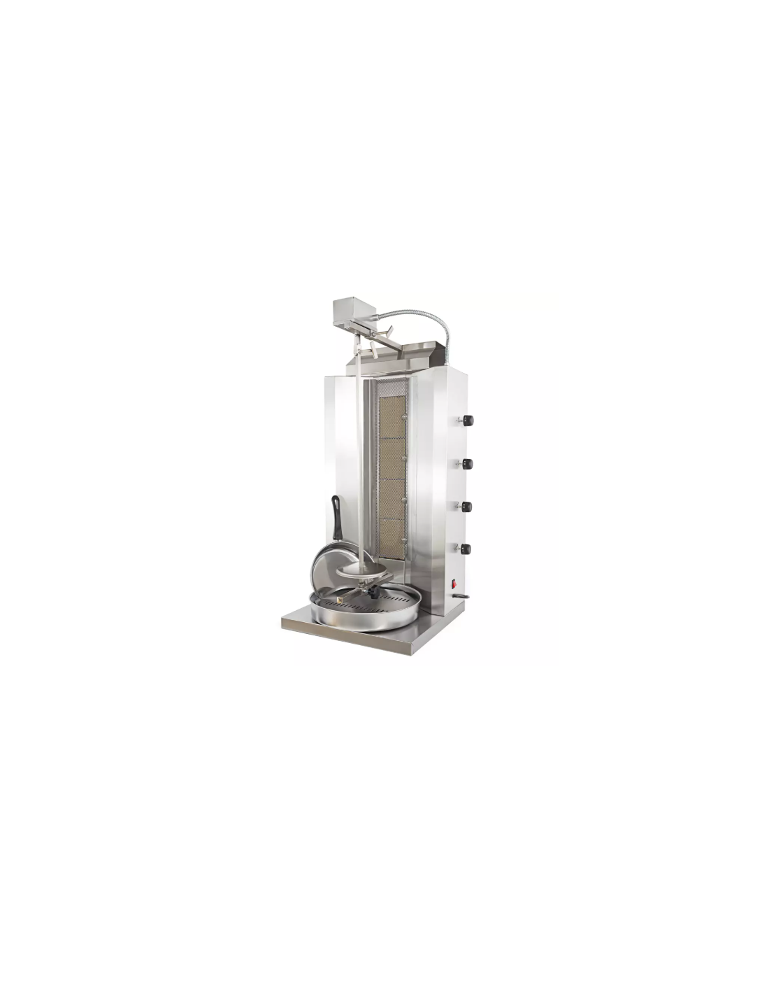 El Asador Kebab AG-40 es la unidad de gas de mayor rendimiento en la gama Sammic, diseñada para operaciones de gran volumen de kebab o gyros. Combina cuatro quemadores verticales con una capacidad de carga de hasta 35 kg y una altura útil superior de 845 mm. Esto lo hace ideal para asar grandes pilares de carne, asegurando una cocción uniforme y eficiente para negocios con alta rotación.
