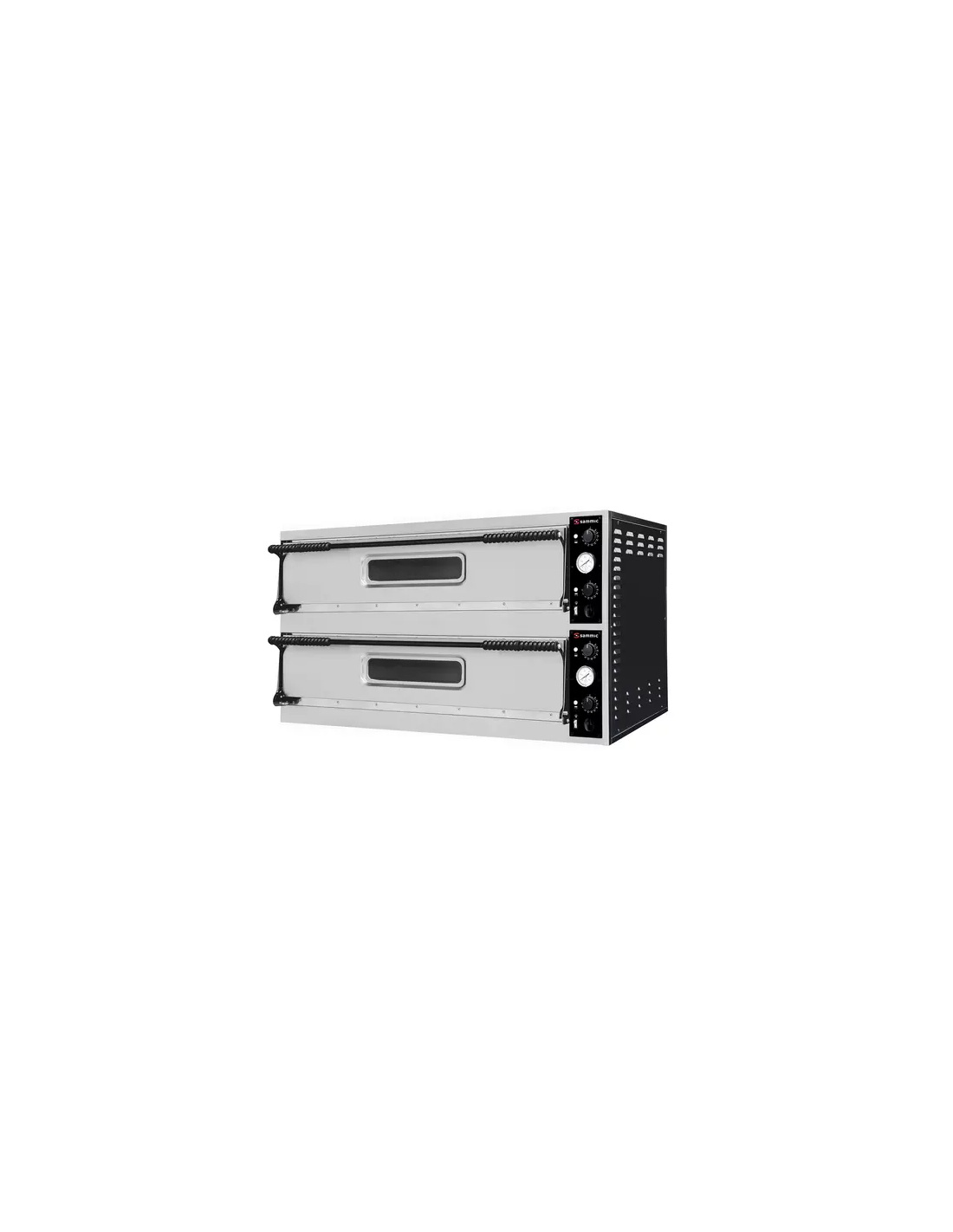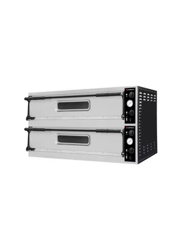 Cada una de sus dos cámaras independientes está equipada con controles separados para las resistencias superiores e inferiores, ofreciendo un control total sobre las 12 pizzas que puede albergar. La cocción se realiza sobre una piedra refractaria de cordierita, vital para conseguir una base crujiente y auténtica. El diseño robusto en acero inoxidable y chapa prebarnizada, junto con el aislamiento de lana de roca evaporada, garantiza la eficiencia energética y la durabilidad, incluso a sus altas temperaturas de trabajo.