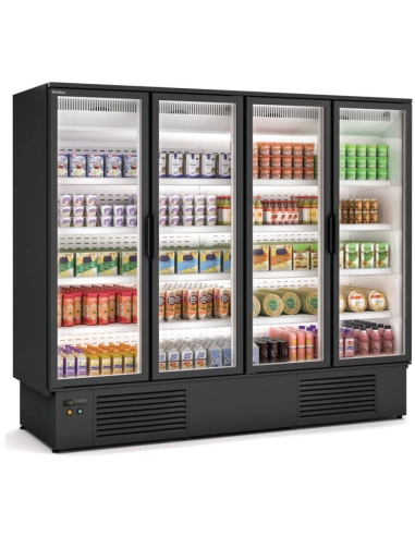 DOCRILUCEl Armario Expositor Refrigerado EFIL 4R es el modelo de cuatro puertas de la serie Efimarket con una altura de 2000 mm. Está diseñado para ofrecer la máxima capacidad y visibilidad en puntos de venta grandes o con restricciones de altura. Este modelo proporciona un amplio volumen neto de 1546 litros y una superficie total de exposición de 3.06 m2. Su robusta potencia frigorífica de 2384 W asegura un rendimiento constante para exhibición y conservación de productos refrigerados o congelados a gran escala.