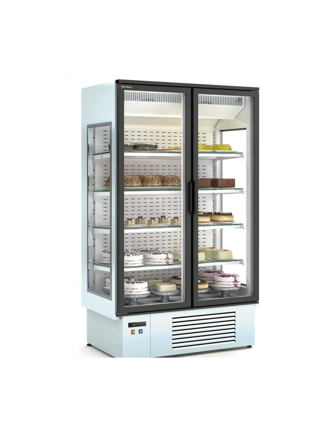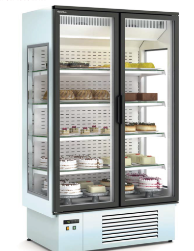 DOCRILUCEl Armario Expositor EFILP-2R es una vitrina vertical refrigerada de dos puertas y altura reducida (2000 mm), diseñado específicamente para la exhibición de pastelería, repostería y delis. Se distingue por incorporar estantes de vidrio securizado, ofreciendo una presentación premium. Con una capacidad bruta de 937 litros y una gran visibilidad, mantiene una temperatura estable en el rango de refrigeración (−1 ºC a +5 ºC).