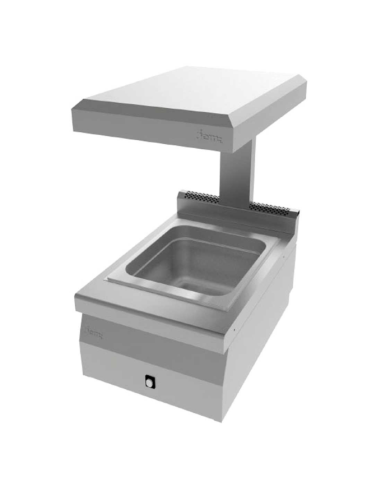 Se trata de una unidad modular eléctrica que permite mantener la temperatura de productos ya cocinados. La imagen muestra una estructura que puede incluir un calientaplatos superior o una lámpara de calor (estante), y una cuba inferior compatible con un recipiente de tamaño GN 2/3 y de profundidad (aunque el uso de SCI60 como mantenedor de fritos a veces solo implica la cuba). Funciona con una potencia de 0,8 Kw y se conecta a una red eléctrica monofásica de 220 V. Es una solución de bajo consumo para mantener la calidad y el calor de los alimentos listos para el servicio.