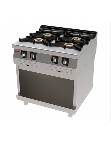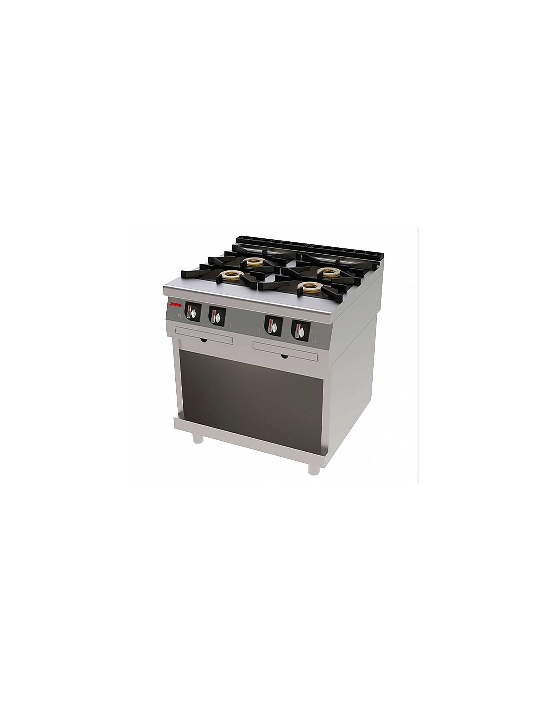 Este modelo de cocina profesional, identificado como T741, es una cocina de gama industrial con soporte y mueble inferior cerrado. Combina la eficacia de sus 4 quemadores de alto rendimiento con una estructura que facilita su instalación y ofrece una base sólida. Es la opción perfecta para optimizar el flujo de trabajo en entornos de hostelería, asegurando potencia y durabilidad.