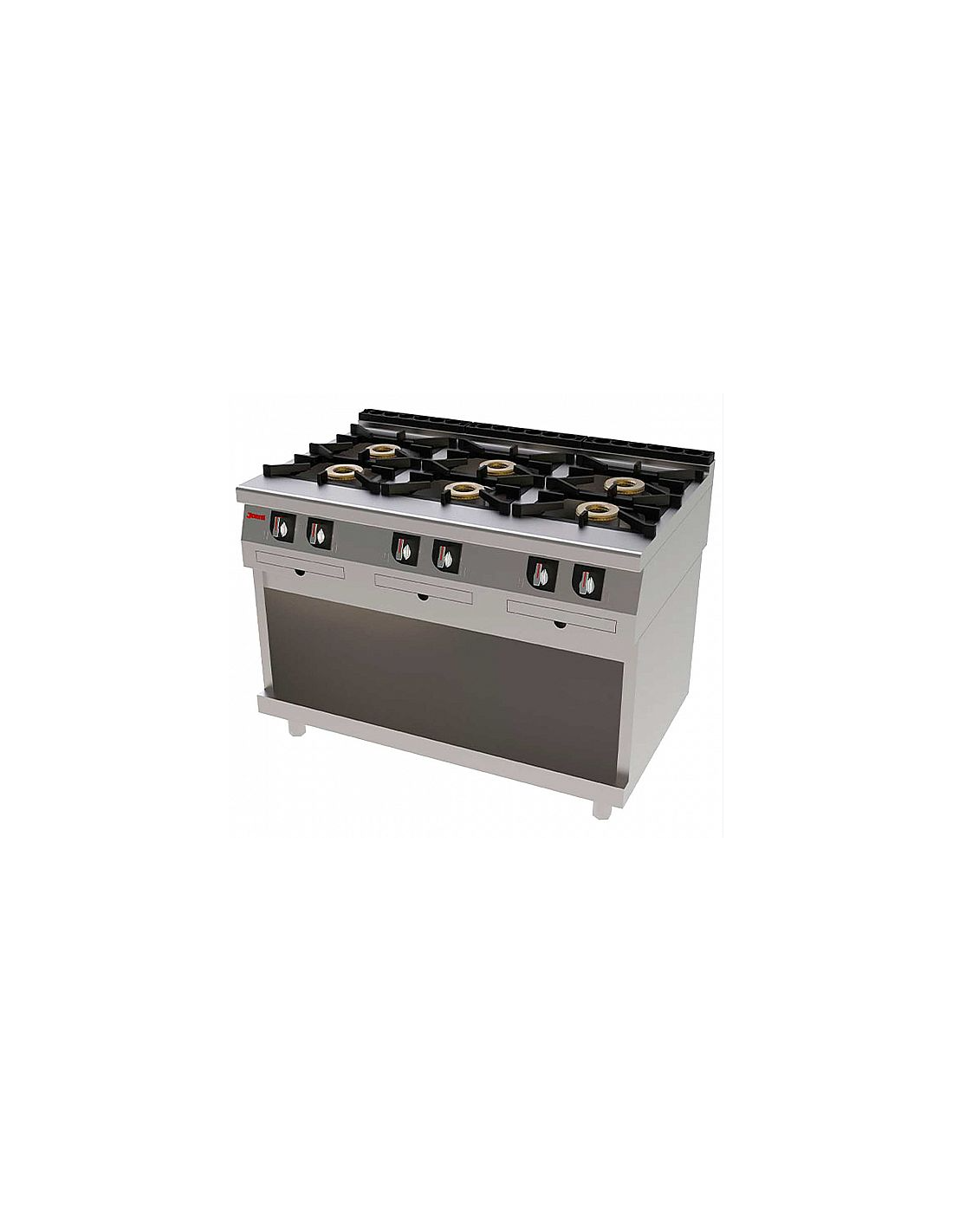 Este modelo industrial, identificado como T761, maximiza la eficiencia en la cocina. Es una unidad de pie con un mueble inferior cerrado que ofrece un apoyo estable y limpio. La parrilla superior está equipada con seis quemadores individuales de $7,4$ Kw cada uno, lo que permite manejar múltiples preparaciones simultáneamente. Su construcción en acero inoxidable (implícito en el diseño industrial) y sus dimensiones robustas ($1200 \times 750 \times 850$ mm) la hacen perfectamente adecuada para el trabajo continuo en hostelería.
