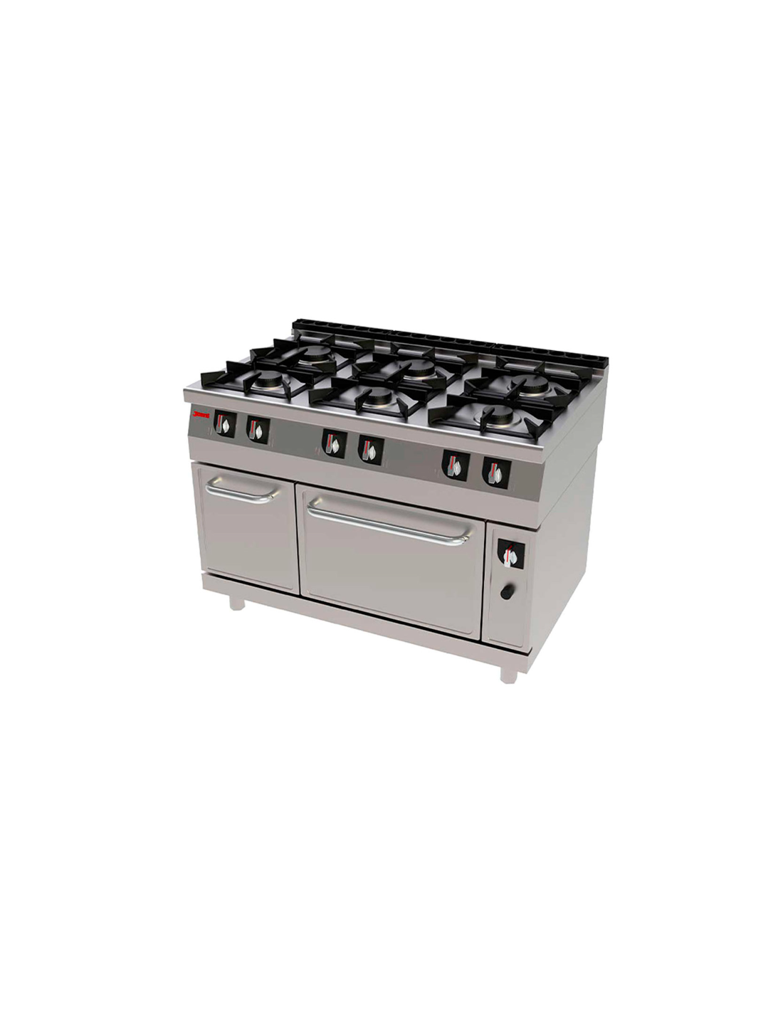 Un equipo de cocina de 1200 mm de ancho y 850 mm de altura de trabajo. Dispone de seis quemadores en la superficie superior y un amplio compartimento inferior. La ficha técnica especifica que la opción inferior es un "Armario caliente con guías y parrilla GN" (Hot cupboard Guides and Grill GN), con una potencia de 5 Kw.
