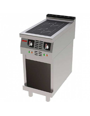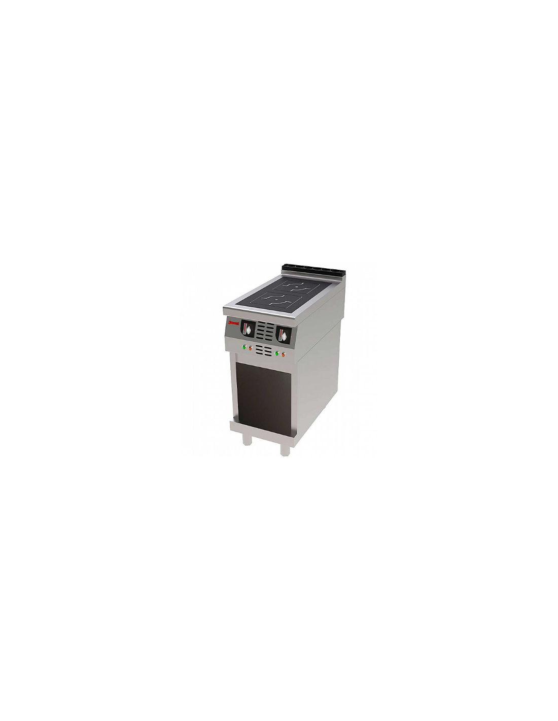 Un equipo de cocción eléctrico de 400 mm de ancho, diseñado para instalación de suelo (de pie). Dispone de dos zonas de cocción de diferente potencia y diámetro. La unidad cuenta con una base o mueble inferior, lo que eleva la superficie de cocción a una altura ergonómica. Requiere una conexión eléctrica industrial (400 V III N + T).