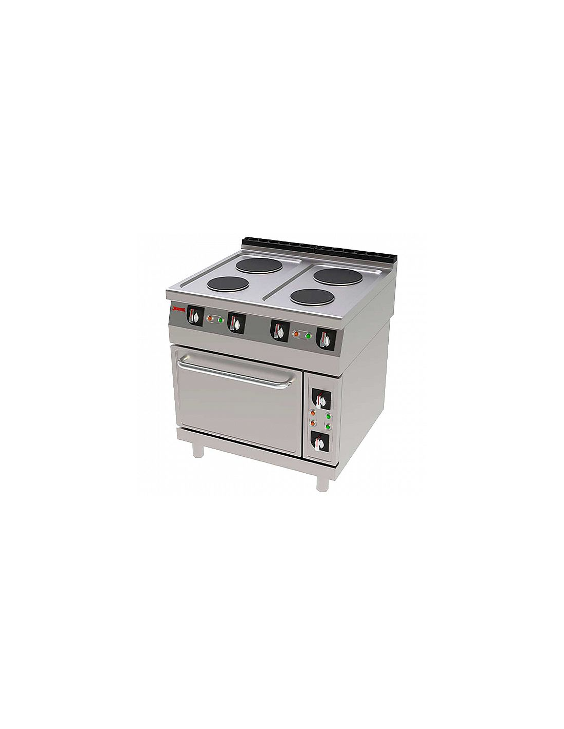 Un equipo de cocción eléctrico robusto y completo con dimensiones de 800 x 750 x 850 mm. Ofrece una superficie superior con cuatro placas para la cocción intensiva y un horno inferior para asar o calentar. Su alta potencia y diseño integral lo hacen adecuado para un uso continuo. Requiere una conexión eléctrica industrial (400 V III N + T).