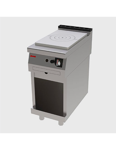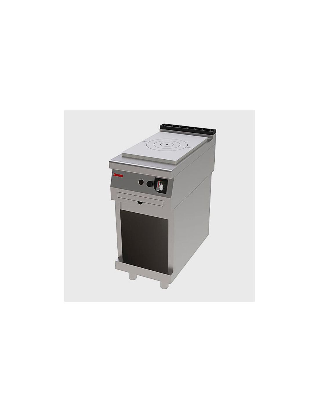 Un equipo de cocción de suelo (de pie), alimentado eléctricamente, que probablemente utiliza una placa de cocción de metal (cromo o acero). Su potencia se distribuye en una única zona de cocción que se alimenta de dos resistencias de 2,25 Kw cada una. El equipo requiere una conexión eléctrica industrial (400 V III N + T).