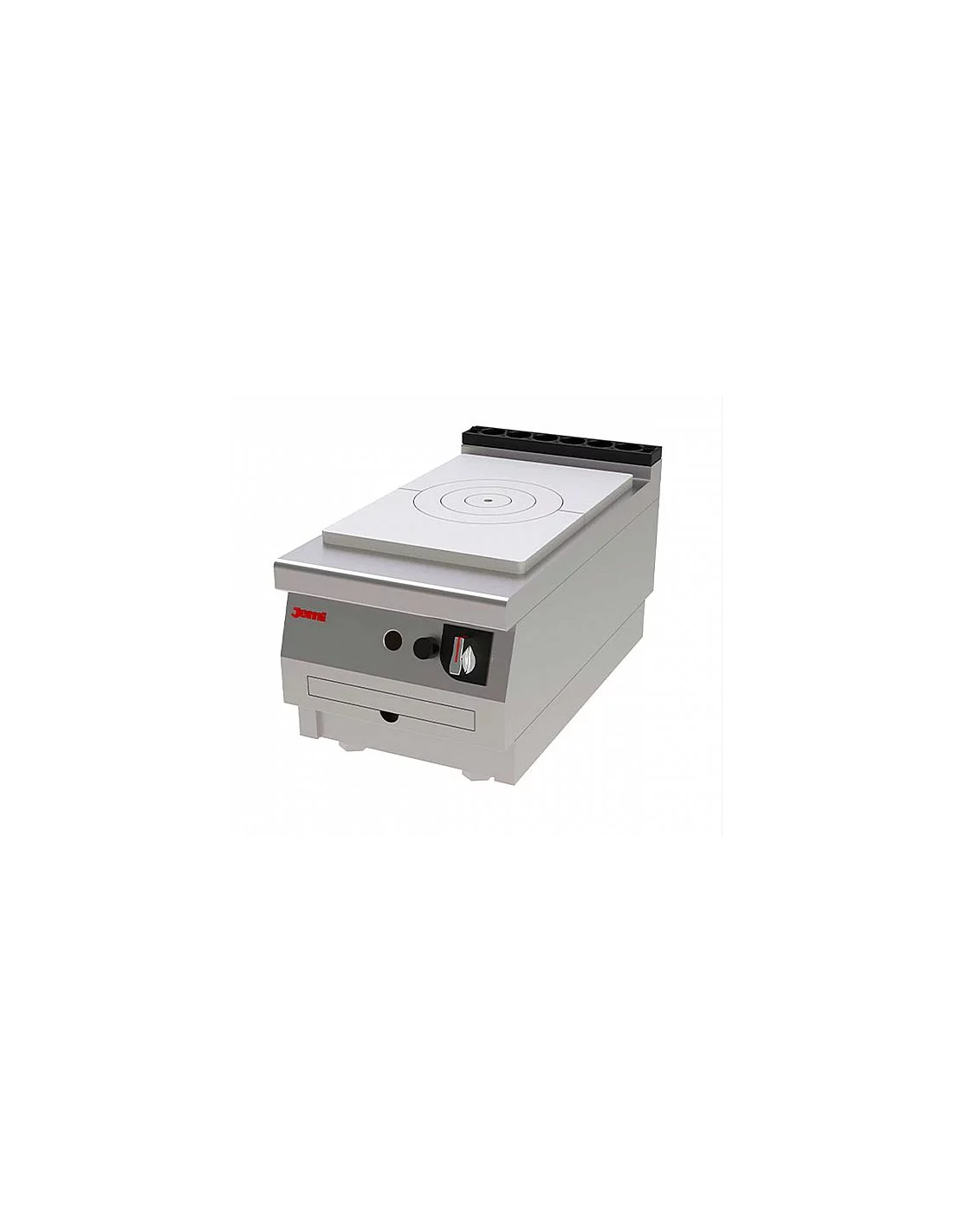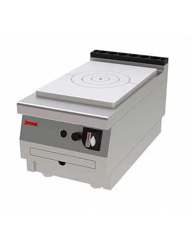 Un equipo de cocción de bajo perfil (290 mm de alto), alimentado eléctricamente, que utiliza una placa de cocción de metal. Su potencia se concentra en una única zona que es calentada por dos resistencias de 2,25 Kw cada una. El diseño de sobremesa facilita su colocación y reubicación. El equipo requiere una conexión eléctrica industrial (400 V III N + T).