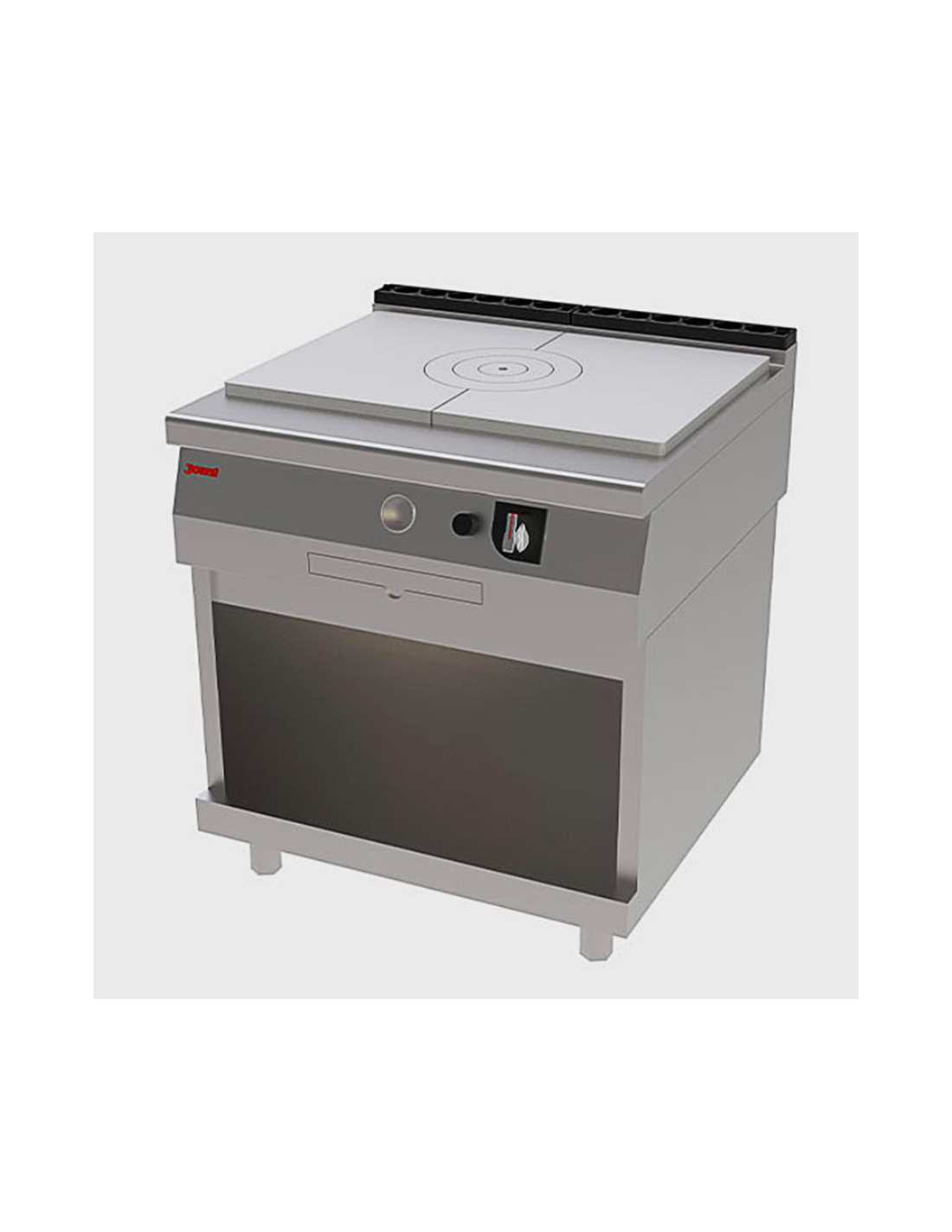 Un equipo de cocción de bajo perfil (290 mm de alto), alimentado eléctricamente, que utiliza una placa de metal. La amplia superficie de cocción es calentada por un total de cuatro resistencias de 2,25 Kw cada una. Esta configuración asegura un calentamiento potente y uniforme en toda la placa. El equipo requiere una conexión eléctrica industrial (400 V III N + T).