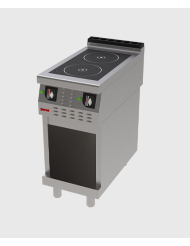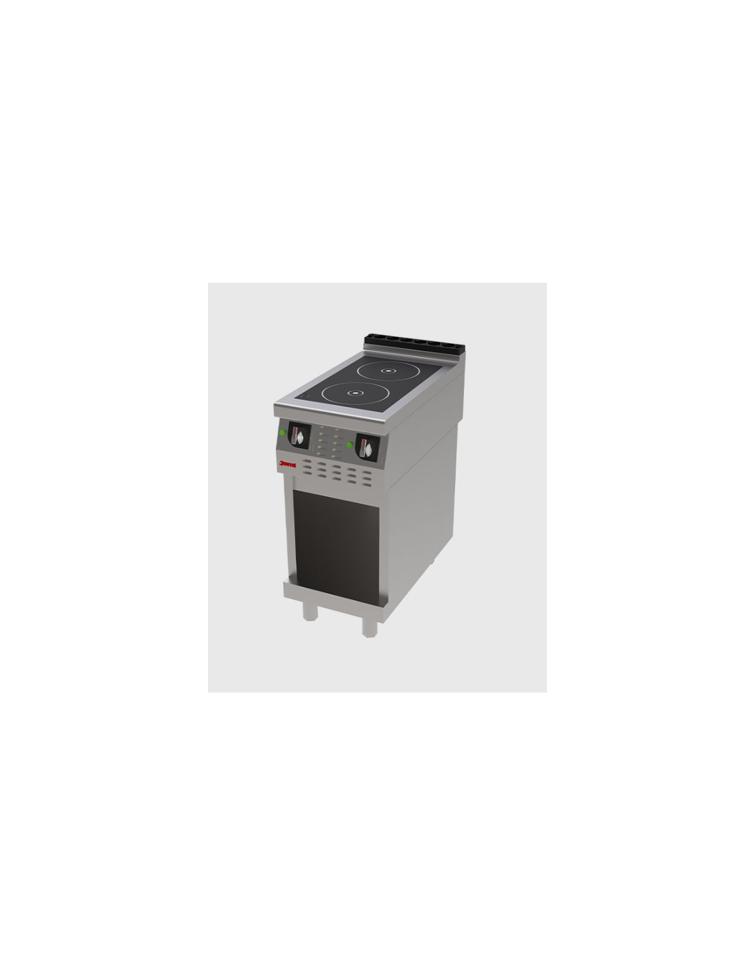 Equipo de cocción de suelo (de pie), alimentado eléctricamente. La superficie es de material Pyroceram, y dispone de una única zona de cocción grande que es calentada por dos resistencias de 2,1 Kw cada una. Esta unidad incluye un mueble base inferior. Requiere una conexión eléctrica industrial (400 V III + T).