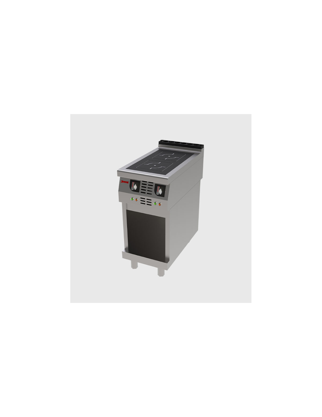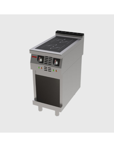 Equipo de cocción de suelo (de pie), alimentado eléctricamente, que utiliza la tecnología de inducción. Su alta potencia permite alcanzar y recuperar rápidamente el calor. Dispone de dos zonas de 5 Kw cada una, proporcionando una capacidad de trabajo excepcional. El equipo incluye un mueble base inferior. Requiere una conexión eléctrica industrial (400 V III + T).