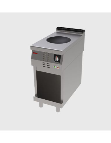 Equipo de cocción de suelo (de pie), alimentado eléctricamente, con dimensiones de 400 x 750 x 850 mm. Utiliza la tecnología de inducción para calentar de forma muy rápida y limpia. Dada su potencia total de 10 Kw, se asume que incorpora dos zonas de inducción de $5$ Kw cada una, con un diámetro de bobina de 300 mm. El equipo incluye un mueble base inferior opcional y requiere una conexión eléctrica industrial (400 V III + T).