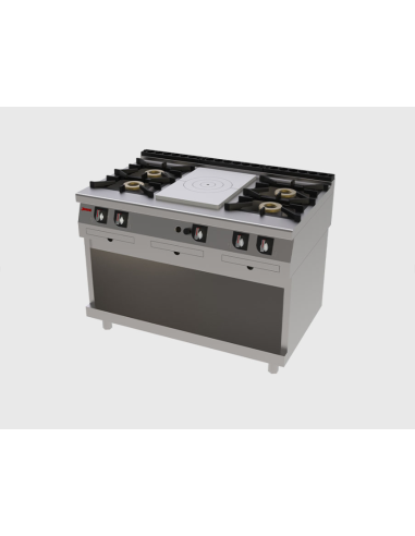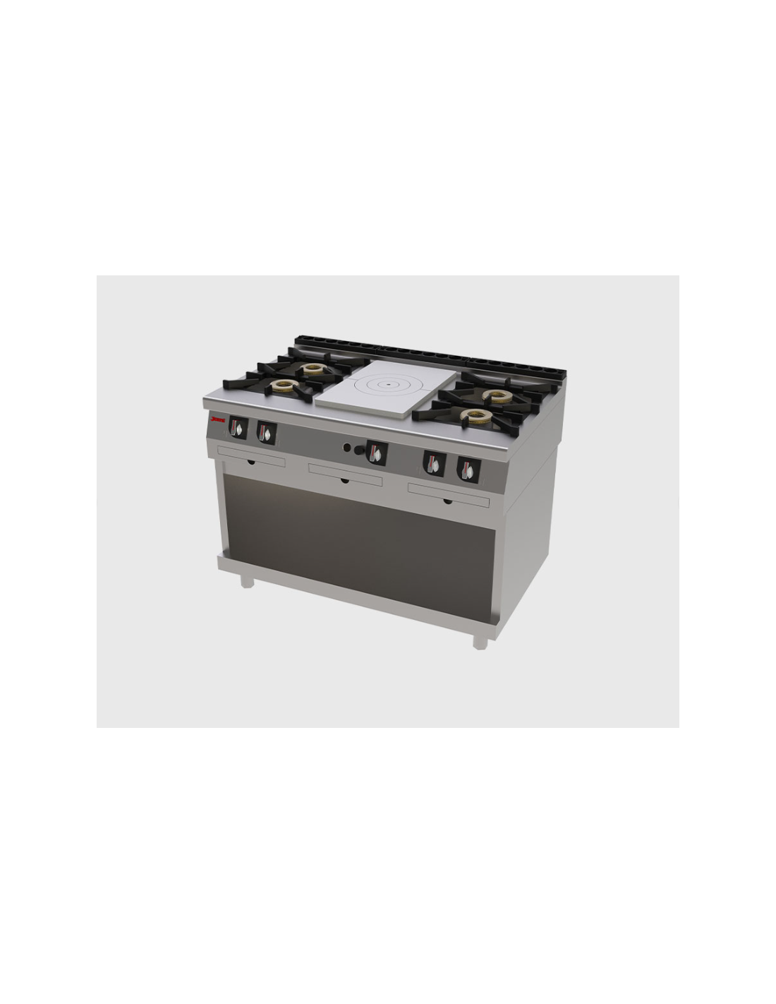 La TP764 es un módulo de cocción profesional de la Serie 750 “Coup de Feu”, diseñado para cocinas de alto rendimiento. Combina una placa de gran espesor para cocción indirecta con cuatro quemadores abiertos de alto poder, permitiendo ejecutar múltiples tareas de cocción simultáneamente. Ideal para entornos de hostelería exigentes.