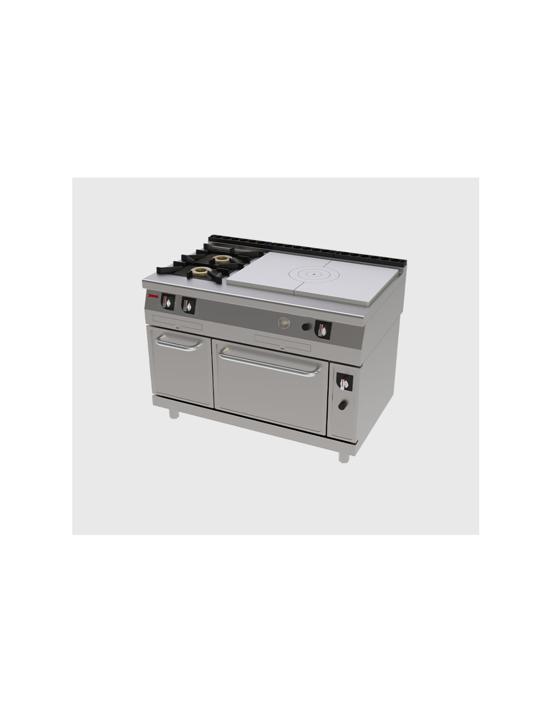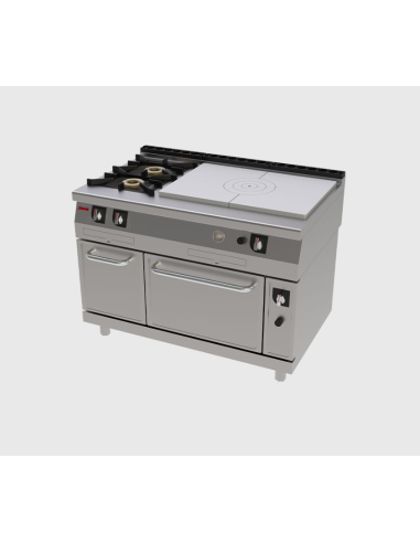 Esta unidad ofrece una combinación versátil de cocción profesional: placa de gran espesor para cocción indirecta, dos quemadores de alto rendimiento para fuego directo, y un horno integrado. Diseñada para cocinas exigentes con fondo estándar de 75 cm y ancho de 1200 mm, permite una gran capacidad de trabajo en un solo módulo
