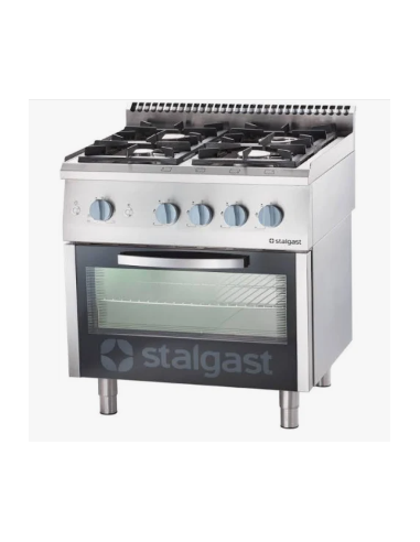 La cocina de 4 quemadores con horno combina un diseño moderno con funcionalidades profesionales para cocinas comerciales. Sus mandos ergonómicos, panel frontal grabado y sistema de seguridad garantizan un uso cómodo y seguro. Los quemadores ofrecen distintas potencias y ahorro de energía, mientras que el horno, disponible en versiones de gas o eléctrico, permite un control preciso de temperatura y humedad, adaptándose a múltiples necesidades culinarias.