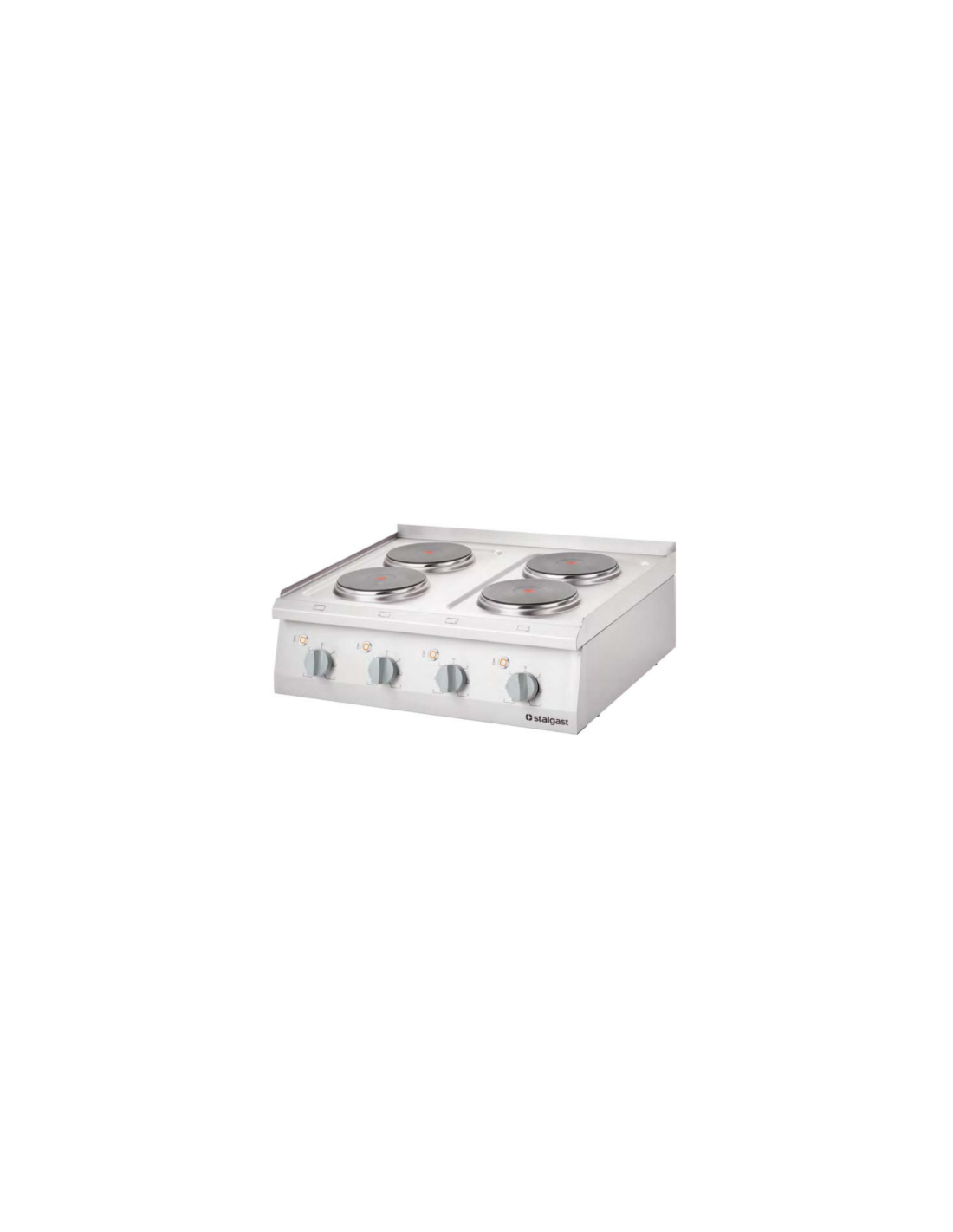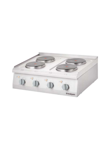 Cocina profesional eléctrica equipada con placas de hierro fundido, diseñada para ofrecer un funcionamiento fiable y duradero en entornos de trabajo intensivo. Gracias a su diseño modular, puede montarse sobre una base abierta o cerrada, adaptándose fácilmente a distintas configuraciones de cocina. Su estructura robusta, mandos ergonómicos y seis niveles de regulación permiten un control preciso y seguro de la temperatura.