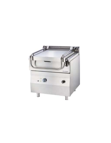 Sartén basculante de gas de diseño moderno, ideal para estofar, cocer y freír. Cuenta con mandos ergonómicos, indicadores luminosos, regulación precisa de temperatura (60–300 °C) y cubeta inclinable manualmente. Con capacidad de 58 L y superficie de trabajo de 0,35 m², es una opción versátil para cocinas profesionales.