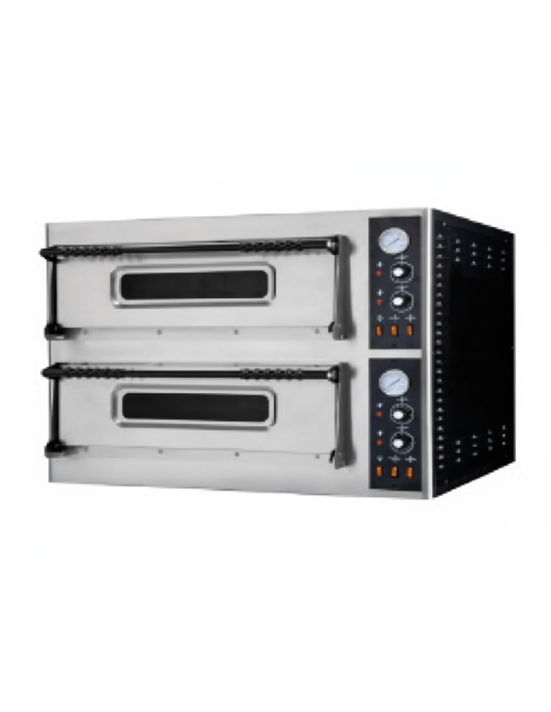 NIKROM - GranitaEl Horno de Pizza Eléctrico B-XL66L es el equipo de cocción de pizza de máxima capacidad, diseñado con un ancho especial para hornear hasta 12 pizzas de 36 cm simultáneamente. Este horno de doble cámara alcanza los 500°C, y está equipado con una potencia extrema de 18 KW, suelo refractario y luz interior de serie. Es la solución más robusta y de mayor rendimiento para pizzerías industriales que manejan un volumen excepcional de pizzas grandes.