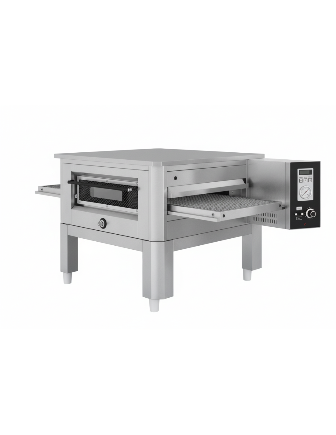Características Generales: Incluye soporte de serie. Permite programar velocidad y temperatura, así como hora de encendido y apagado. Resistencia superior e inferior. Superponibles hasta 3 unidades. Construido en acero inox incluso la cinta transportadora. Puerta de serie para control de la cocción y fácil limpieza.
