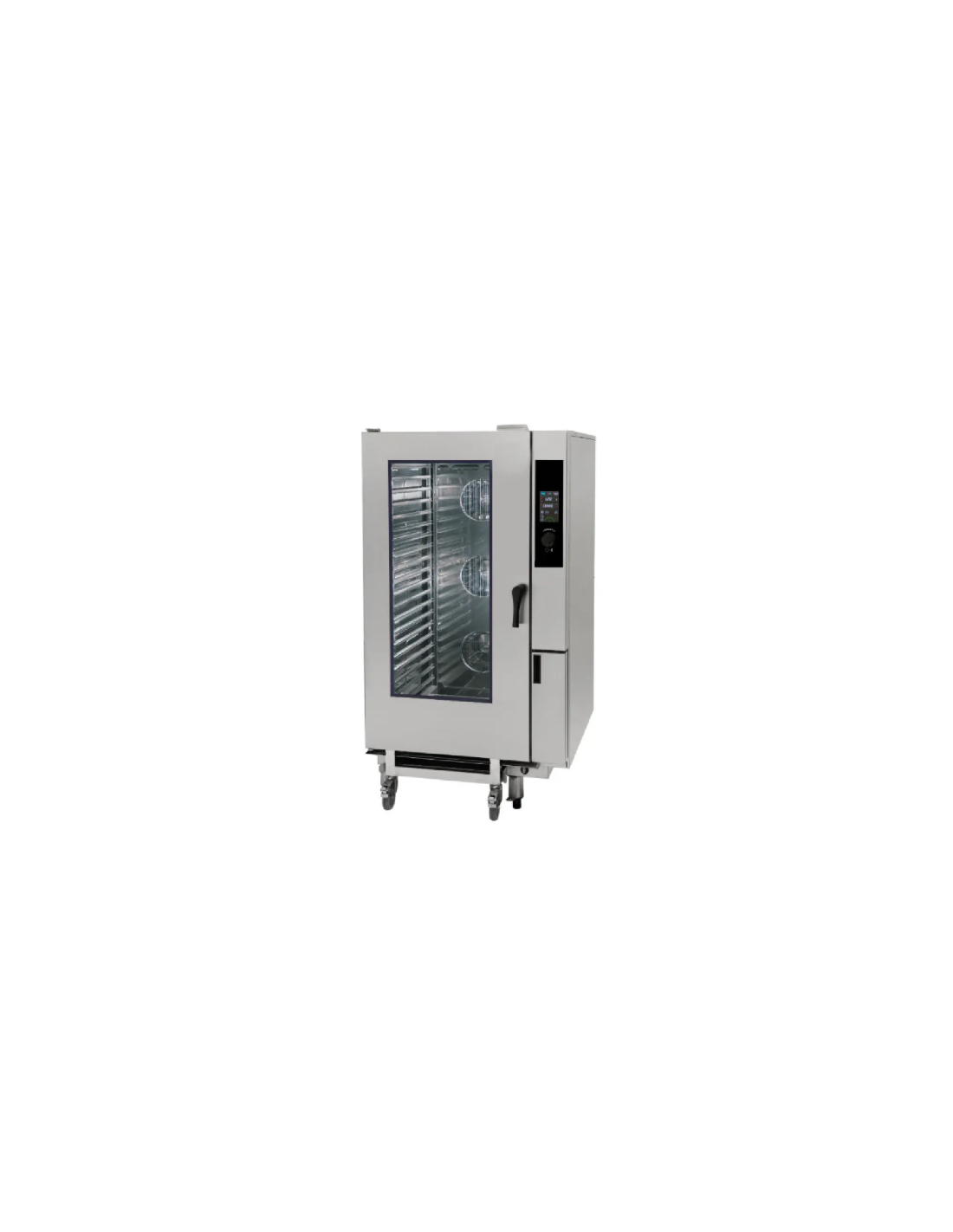 NIKROM - GranitaEl Horno GMC201E es un horno Mixto (Combi) de máxima capacidad, con control Panel touch (táctil), diseñado para 20 bandejas de tamaño GN 1/1. Se clasifica como mixto por su sistema de vapor directo. Es un equipo digital multifunción, que ofrece una potencia de 27,7 KW y requiere tensión trifásica (400V 3F+N). Incluye funciones de serie avanzadas como sonda, lavado automático, conexión USB y carro de serie.