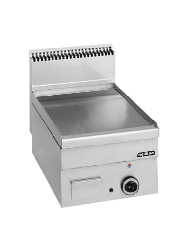 El Fry Top MGFT46L es una plancha a gas de superficie lisa, con dimensiones de 40x51 cm. La plancha es de acero satinado de 12 mm de espesor y cuenta con control termostático de la temperatura. Ofrece una potencia de 5,1 KW y requiere tensión monofásica (230V F+N).