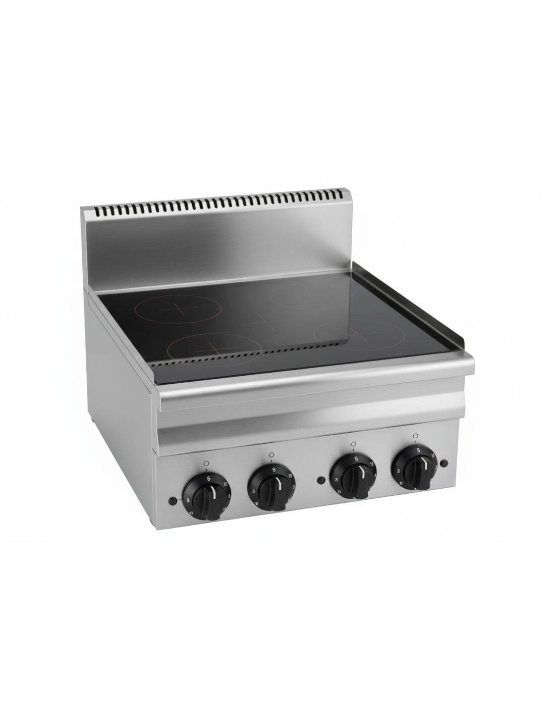 El modelo MEVC46 es una placa vitrocerámica de sobremesa de alta resistencia con cuatro zonas de calentamiento infrarrojo, cada una con regulación independiente, ideal para un control preciso en cocinas profesionales.