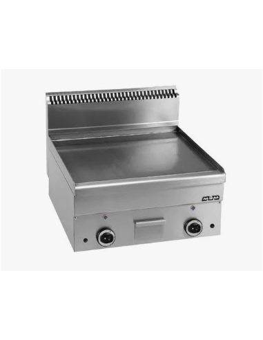 El modelo MEFT66L es un fry top eléctrico de mayor tamaño (60 cm) con plancha lisa de acero satinado de 12 mm de espesor. Cuenta con control termostático, zonas de calentamiento independientes y un amplio cajón recogegrasas.
