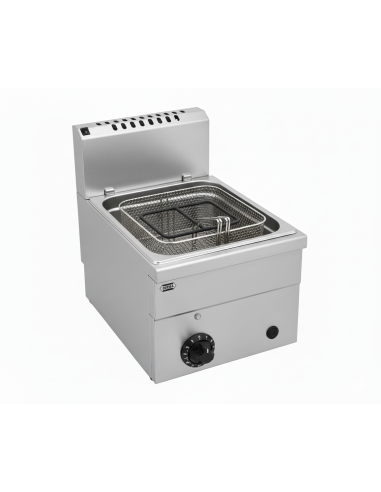 El modelo MEF46 es una freidora eléctrica de sobremesa de 10 L de capacidad. Está diseñada para facilitar el mantenimiento gracias a su resistencia abatible y su cuba prensada con soldadura continua, e incluye termostato de seguridad y una amplia zona fría.