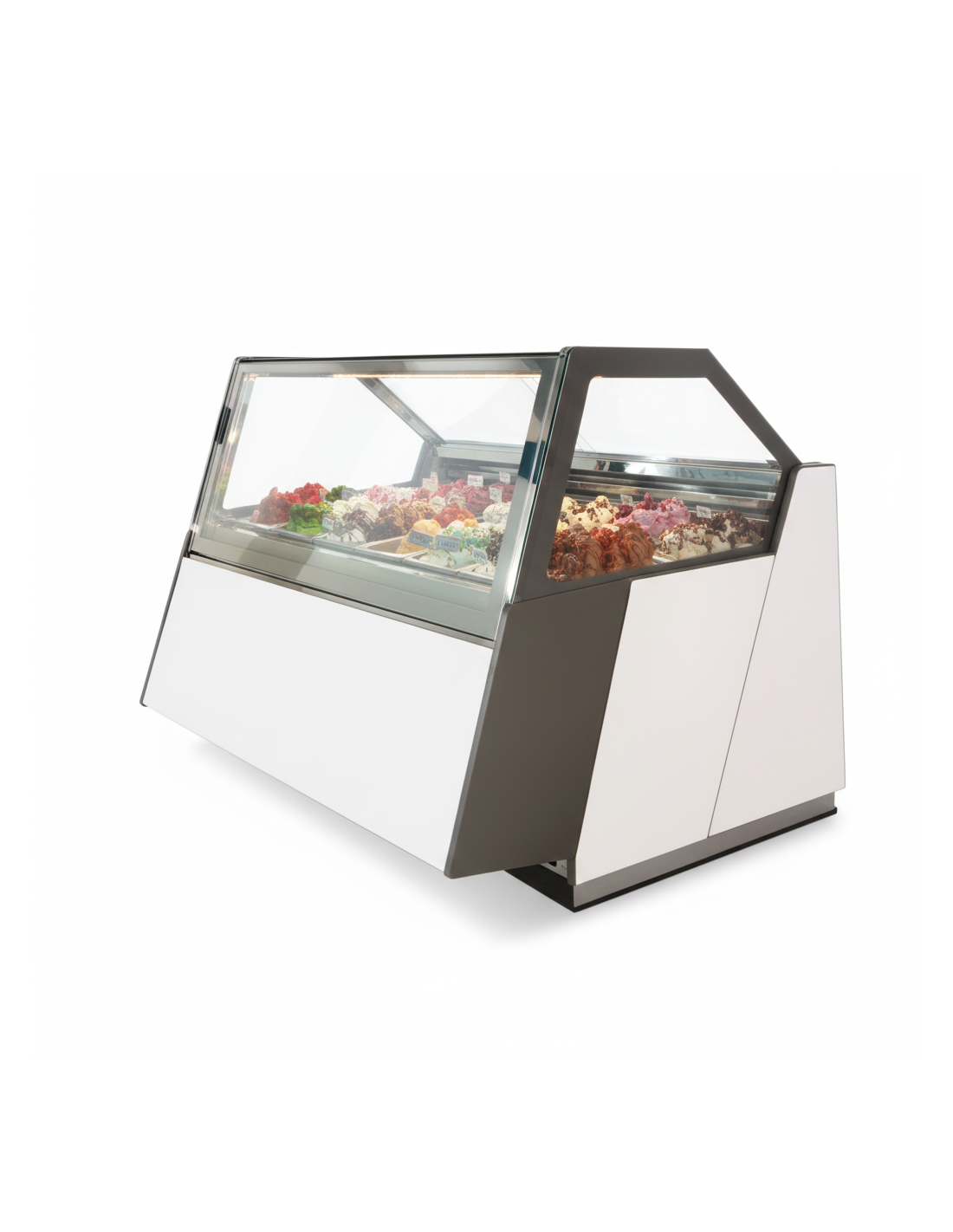 NIKROM - GranitaEl modelo SENIOR 1-TI 130-18 es una vitrina expositora de helados de gran capacidad (18 cubetas) y diseño alto. Su principal ventaja es el doble cristal extra claro calefactado que garantiza una visibilidad perfecta sin condensación. Mantiene una temperatura constante de -20C mediante frío ventilado y cuenta con una estructura robusta de acero inoxidable 304.