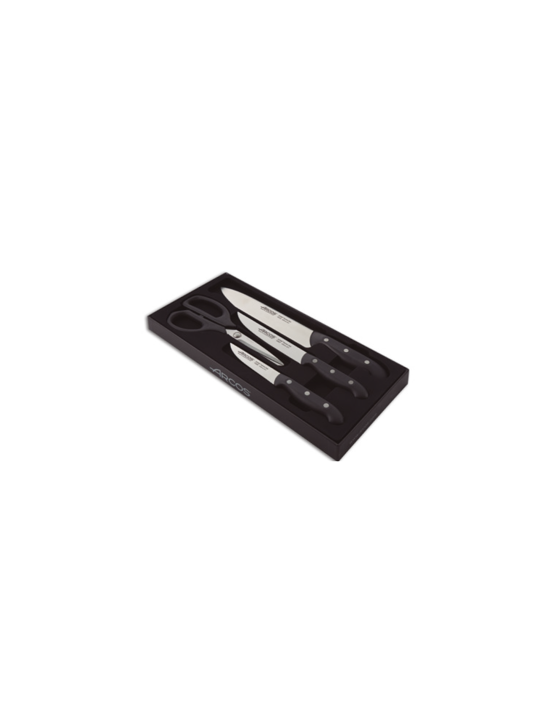 Set 4 piezas, 1 cuchillo mondador(105mm), 1 cuchillo cocina(150mm), 1 cuchillo cocinero(215mm), 1 tijera cocina(215mm), Hoja de acero inoxidable NITRUM