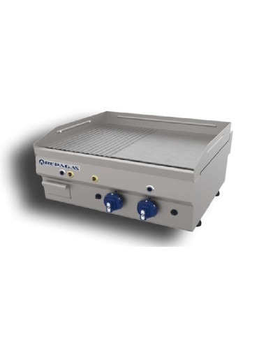 Exterior fabricado en acero inoxidable AISI-304 (18/10) con acabado scotch. Quemadores fabricados en hierro con palastro de acero pulido y rectificado de 15 mm de espesor. Termopar y quemador tubular bajo placa fabricado en acero inoxidable. Piloto de encendido manual y con piezoeléctrico. Palastros especialmente tratados para garantizar la uniformidad y máxima temperatura de trabajo en todos sus puntos. Mandos ergonómicos de poliamida resistentes al calor. cajón delantero recoge-grasas en todos los modelos. Peto lateral y trasero para evitar salpicaduras. Posibilidad de elegir superficie lisa o lisa/ranurada (LR). Patas regulables en altura. 1 Fuego de 4 KW + 1 Fuego de 8 KW.