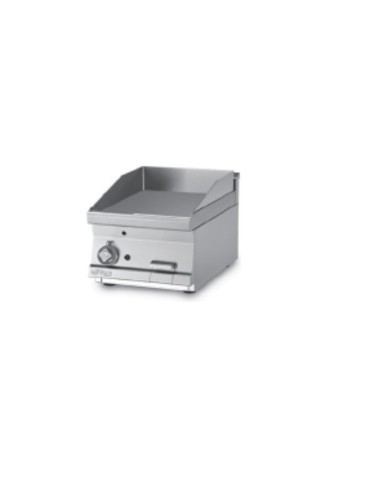 Modelo - Fry-top de gas, para uso profesional. Dotados de placa lisa y/o ranurada, normal o cromada. Placa normal de acero FE430B. Placa cromada de acero FE510C con acabados cromados. Aseguran una resistencia elevada, durabilidad y alcanzan rápidamente la temperatura deseada con regulación de 50 a 300°C. Especialmente fáciles y rápidas de limpiar. Encendido automático de llama piloto de los quemadores por medio de piezoeléctrico, válvulas termostatica de seguridad con termopar. Evacuación de humos posterior, completamente segura. Cubetas recoge grasas de gran capacidad y extraíbles.
